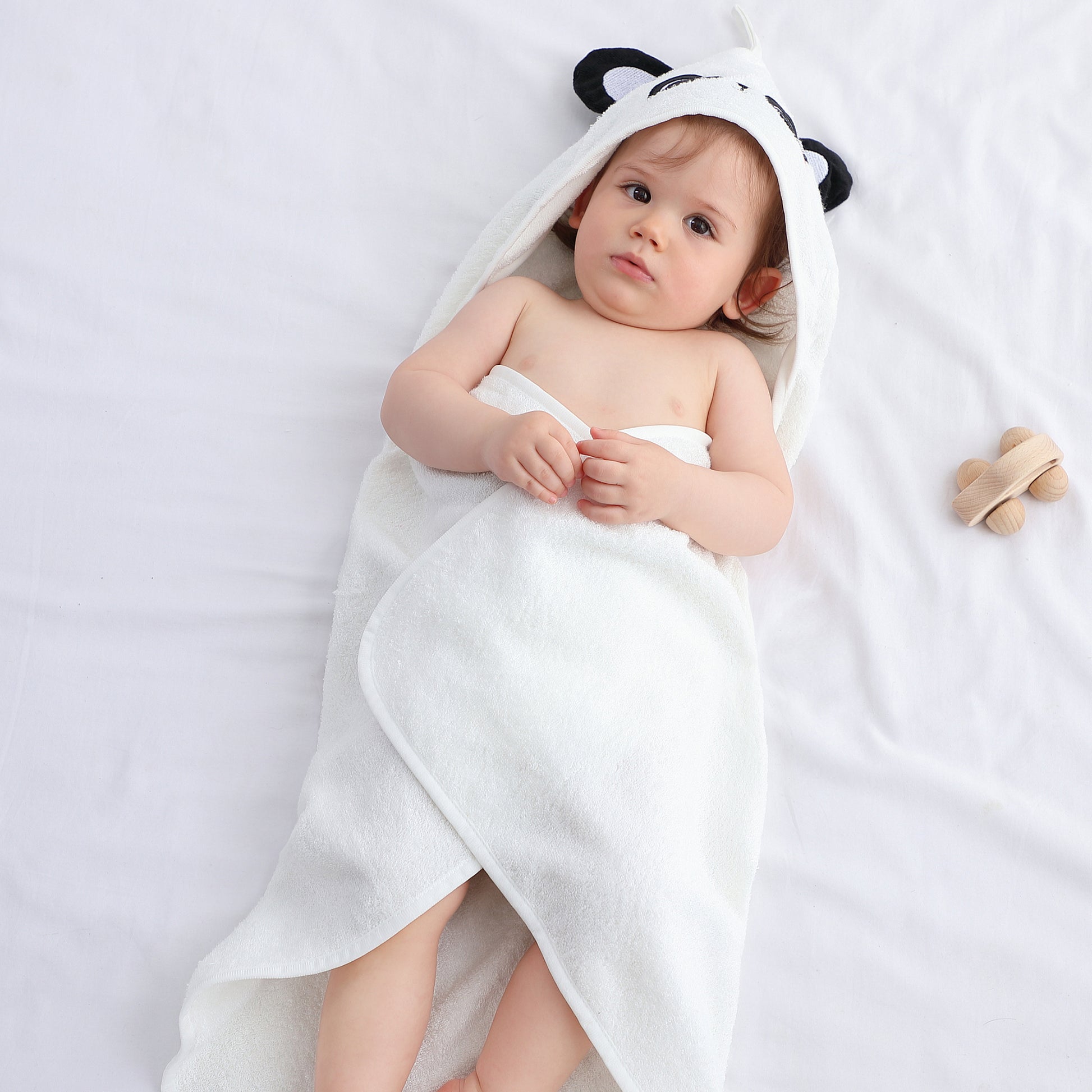 Snuggle up with your little cub's new favourite bath-time buddy, our Panda Pal Bamboo Towel! Made from the softest blend of bamboo and cotton, this adorable towel wraps your baby in cloud-like comfort after every splash. With its playful panda hood, sweet embroidered face, and little round ears, it's designed to make drying off a moment of joy. Ultra-absorbent, breathable, and kind to delicate skin, it keeps your little one warm, cosy, and smiling from bath to bedtime.
